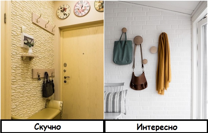 Такие крючки подойдут для хранения сумок, шарфов, зонтов и прочих аксессуаров. Чтобы они смотрелись интересно и привлекали внимание, используйте ассиметричную развеску – она будет особенно полезна, если вы не смогли найти фактурные крючки и купили типовые модели. Так вы сможете добавить прихожей ощущение динамики. Кстати, если у вас красивые дверные ручки, можете использовать их вместо крючков. Главное, не переборщить и не загромождать их вещами. Для шкафа также можно подобрать такие ручки, чтобы с двух сторон за них можно было зацепить пакет или сумку, которые не хочется ставить на пол.