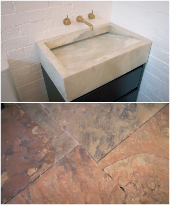 Главными «достопримечательностями» ванной комнаты стали каменный пол и раковина из оникса (Scissett, Великобритания).