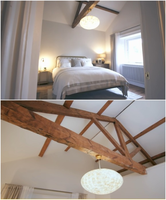 На втором этаже две сырых сумрачных комнаты превратились в стильные спальни. Чтобы визуально увеличить объем пространства, была заменена крыша и ее структура. Благодаря тому, что крыша стала двускатной фронтальной и без потолка, образовавшееся А-образное пространство позволило создать эффектный дизайн. Этому поспособствовала предусмотрительность ребят. Когда во время демонтажа старых перекрытий были обнаружены добротные балки, они их не утилизировали, а очистили, восстановили повреждения и использовали для создания имитации опорной балочной конструкции. Стоит отметить, что в историческом здании энтузиасты сохранили и старинные чугунные камины, они стали оригинальным дополнением к минималистскому дизайну.