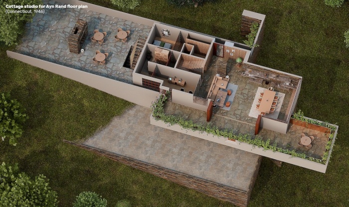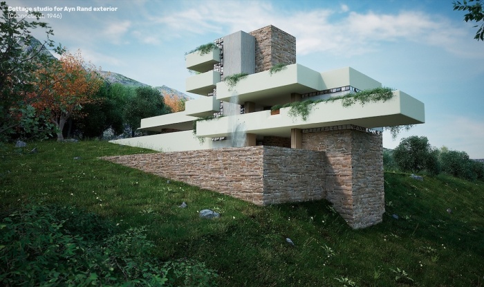 Айн Рэнд пришла в восторг от проекта Райта, но строительство коттеджа так и не началось (3D-рендеринг NeoMam Studios). | Фото: architecturaldigest.com.