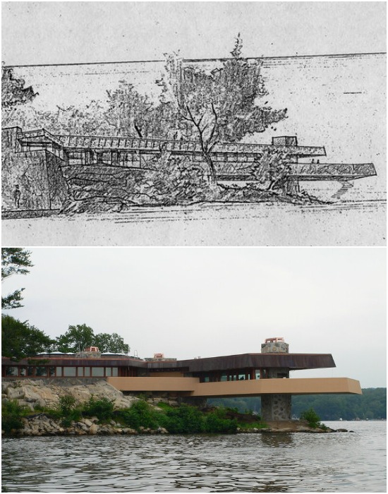 Примечательно: Во время разработки проекта знатная дама поощряла нестандартные решения Фрэнка, который привносил оригинальные нотки в дизайн структуры (отсюда и отличия от общепринятых норм и модных тенденций того времени). Хотя в конечном итоге она отвергла разработанный перспективный проект, символично оставив его на полу кабинета, как и многие другие работы Райта.