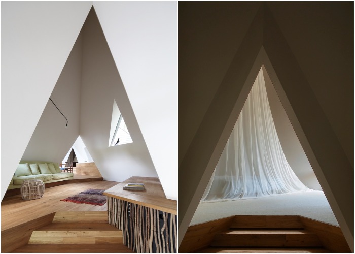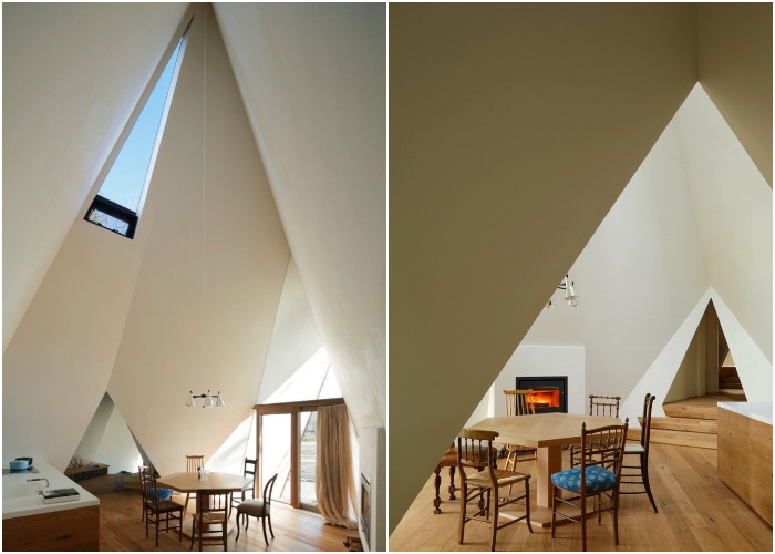 Остроконечные крыши, напоминающие деревянные палатки или вигвамы индейцев, максимальное остекление, задействование пространства в глубине наклонных зон, многоярусность – все это позволило создать комфортное жилище максимально приближенное к самой природе и истокам. Если говорить о современных удобствах, то лесной дом ни в чем не уступает городским жилищам. Это внедрение системы теплый пол и кондиционирование воздуха в каждой комнате, дровяной камин и особая система вентиляции, способная перемещать теплый воздух из верхней части комнаты в и зону пола зимой, автономная канализационная система и оборудование, позволяющее собирать и очищать дождевую/талую воду, в том числе и сточную, которая используется для полива огорода и смыва туалетов.