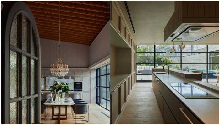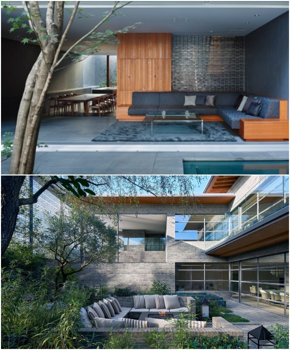 Главные жилые зоны, включающие кухню, столовую, спальные и ванные комнаты отделены от внутреннего двора стеклянными стенами, благодаря чему стирается грань между окружающим миром и помещениями. Так что живя в центре крупного города, жильцы дома не теряют связь с природой, ежедневно наслаждаясь ее красотой и подпитываясь мощной энергетикой.