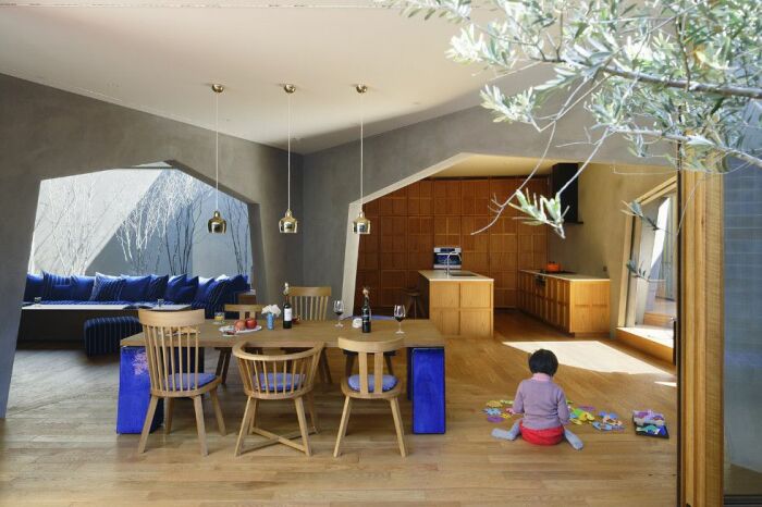 Интерьер столовой и кухни в доме, спроектированном Hiroshi Nakamura & NAP (Optical Glass Bricks, Хиросима).