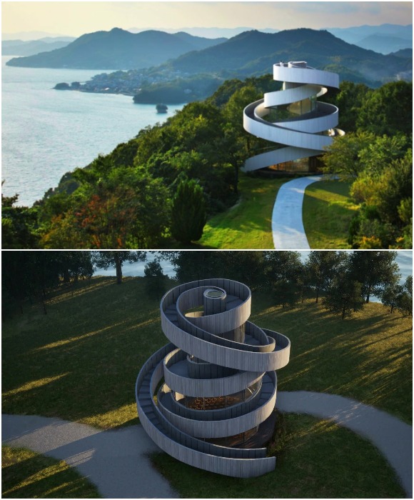 Лестничные пролеты, переплетаясь между собой, поддерживают друг друга (Ribbon Chapel, Ономичи).