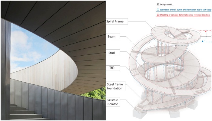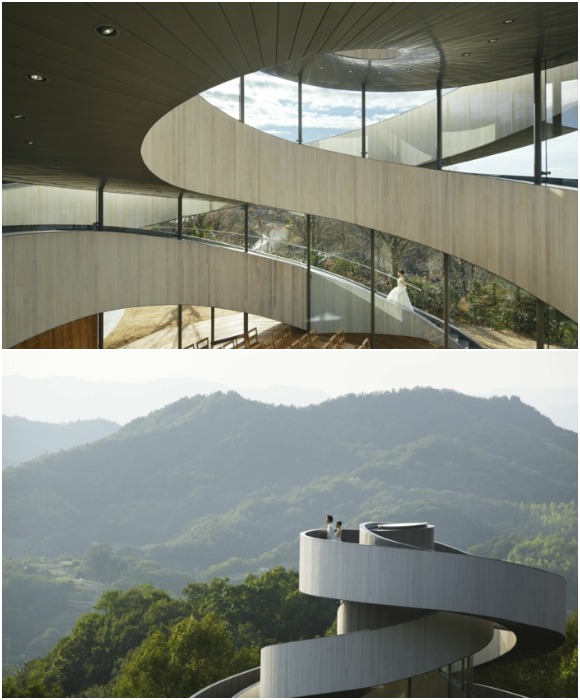 Извилистые лестничные пролеты, по которым проходят жених и невеста (каждый по своей лестнице), наполняют их сердца глубокими воспоминаниями и эмоциями, чтобы встретиться в зале бракосочетания. Там они могут попросить благословения у небес и объявить о своем намерении жить вместе. «Переплетая две винтовые лестницы, мы реализовали самонесущую конструкцию, которая использует архитектурный язык, чтобы подчеркнуть таинство брака, усиливая эмоции. Двое, которые раньше шли разными путями, становятся общим целым на верхней площадке, а затем спускаются по лестнице уже вместе. По сути, это архитектура, состоящая исключительно из потока движения», – говорит автор проекта о своем неординарном решении.