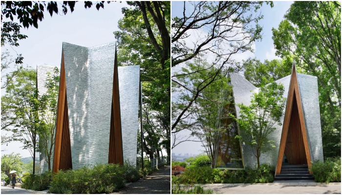 «Лесная часовня» (Sayama Forest Chapel) расположена на территории кладбища в Саяма Лейксайде, которое открыто для всех религий. Учитывая это обстоятельство и то, что под строительство культового сооружения выделен небольшой треугольный участок земли неудивительно, что структура имеет самую неожиданную конструкцию, когда-либо возведенную для религиозных церемоний. Необычной форме фасада и конфигурации крыши поспособствовали деревья, которые Хироши Накамура не только не стал уничтожать для подготовки строительной площадки, а как раз наоборот, были еще и посажены по периметру в свободных пролетах.