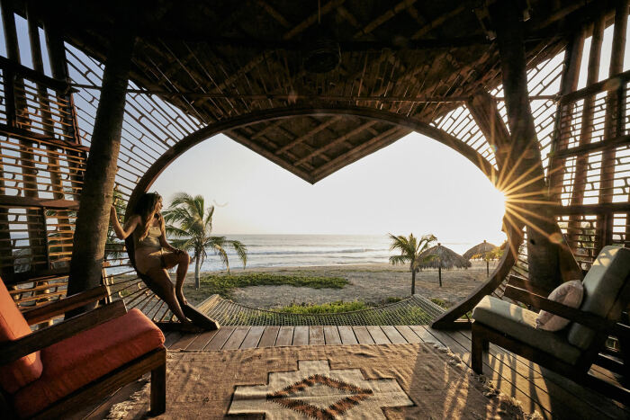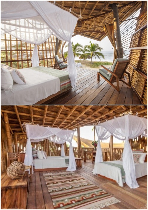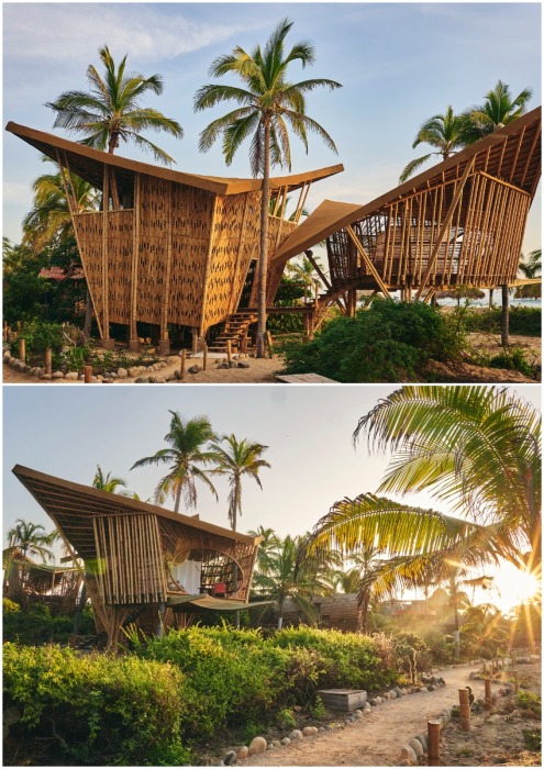 Благодаря стараниям дизайнеров голландской студии Atelier Nomadic, прославившейся проектами ориентированным на биофильную архитектуру и устойчивое строительство, на территории мексиканского эко-курорта, относящегося к сети Playa Viva, появились очаровательные бамбуковые домики на дереве. Они являются благоустроенными отельными номерами, которые ничем не уступают роскошным апартаментам фешенебельных гостиничных комплексов.