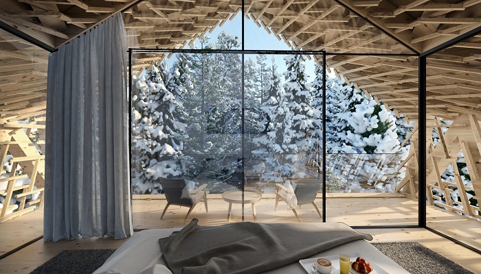 Интерьер апартаментов Люкс в отеле, расположенном среди нетронутой красоты первозданного леса (концепт Tree Suites). | Фото: aasarchitecture.com.