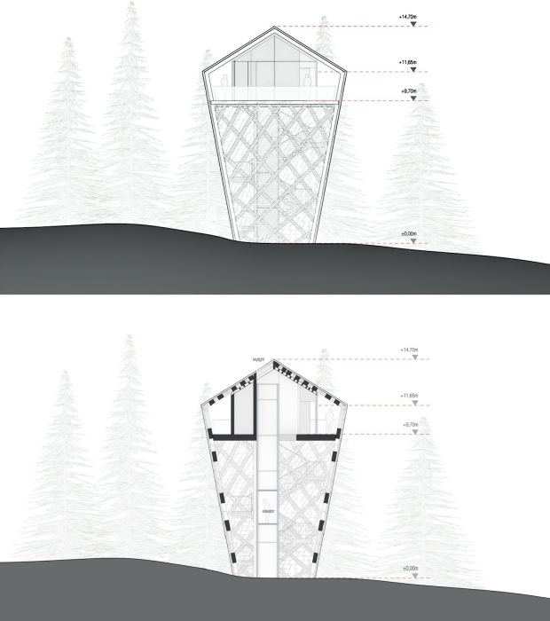 Пока этого не произошло, мы можем лишь посмотреть, что предлагают дизайнеры архитектурной студии Peter Pichler Architecture. «Связь между людьми и природой является фундаментальным критерием в этом проекте. Он должен активировать и усиливать человеческие чувства благодаря использованию простых, при этом традиционных для этих мест материалов. Жизнь среди верхушек деревьев с неограниченным обзором на горные вершины и бескрайний густой лес позволит немного остепениться и расслабиться», – комментируют свое решение специалисты студии.