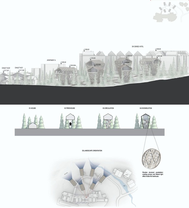 Предполагается, что горнолыжный курорт будет состоять из постоянно достраивающихся Люксов и общественных объектов, тоже возвышающихся над лесной поляной: административный корпус, ресторан и спа-салон. Сами же домики на дереве будут отличаться площадью и количеством комнат, их размер варьируется от 60 до 80 кв. метров. Главная изюминка проекта - стеклянные лифты, которые домчат в апартаменты, хотя предусмотрена и элегантная лестница для тех, кто предпочитает активный отдых. Какой бы способ подъема гости отеля не выбрали, в том и другом случае они смогут наслаждаться постепенно открывающейся красотой живописного пейзажа. Однокомнатные апартаменты предусматривают наличие просторной спальни со стеклянными стенами, зону гостиной у фасадного окна, благоустроенную ванную комнату и открытую террасу с зоной отдыха, откуда открывается потрясающий вид на окружающий лес и горы.