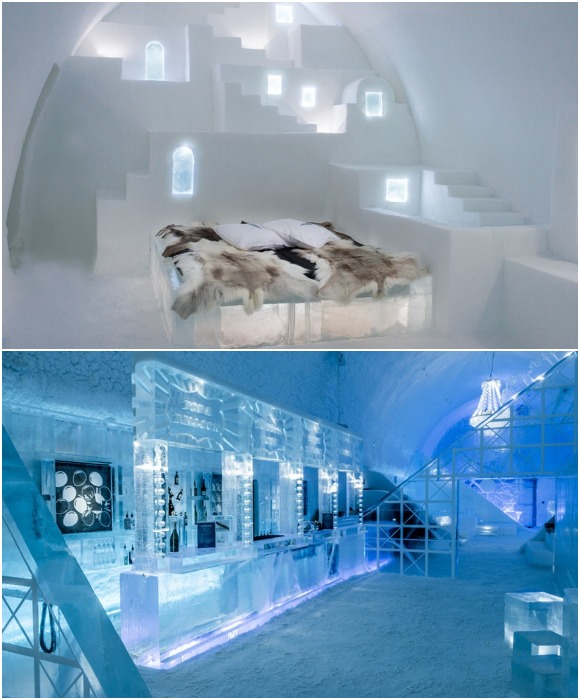 5 месяцев в году гости отеля могут переночевать в ледяном номере и наслаждаться горячительными коктейлями в ледяном баре (Ice Hotel, Швеция).