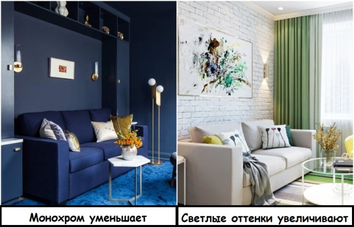 Синий цвет визуально уменьшает комнату, а светлые оттенки - увеличивают
