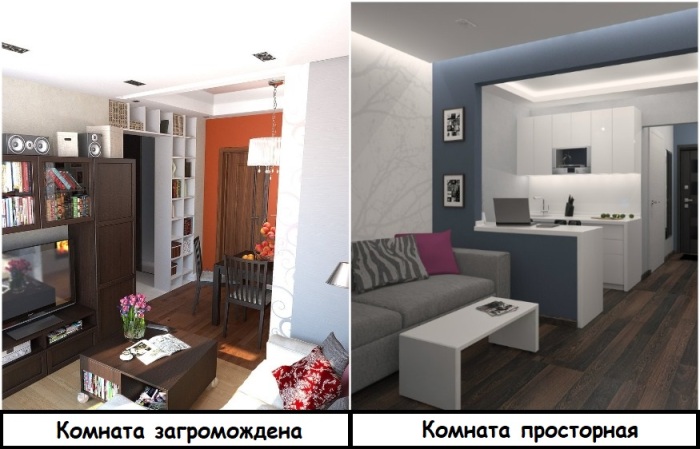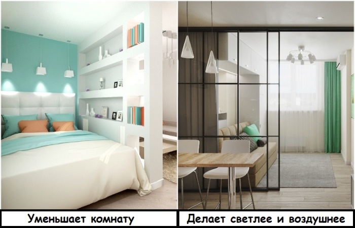 Владельцы крохотных квартир мечтают разделить имеющуюся площадь на зоны таким образом, чтобы получилось оформить отдельную спальню, кабинет, кухню-гостиную и пр. И это желание является вполне обоснованным, особенно если в квартире живет несколько человек. Однако маленькое жилье не предназначено для большого количества перегородок. Они съедают все полезное пространство и лишают воздуха, в результате чего квартира превращается в лабиринт.