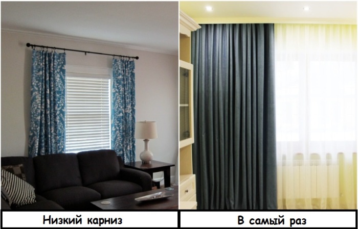 Одним из самых популярных дизайнерских трюков являются шторы под потолок и в пол – это простой способ сделать потолки в комнате визуально выше (особенно актуально для хрущевок). Странно, что некоторые до сих пор игнорируют этот невероятно полезный прием, предпочитая вешать карнизы слишком низко. Эффект соответствующий – и без того маленькая комната становится еще более тесной, стены начинают давить.