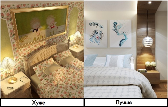Без декора интерьер выглядит скучным и блеклым, но в процессе его подбора нужно быть максимально аккуратным. Если переборщить с аксессуарами или украсить комнату вещами, которые абсолютно не сочетаются между собой, получится абсолютно безвкусный интерьер. Самыми коварными являются крупные картины в массивных рамах. Они перетягивают все внимание на себя, плюс на фоне ярких полотен помещение визуально кажется меньше. В случае с небольшими комнатами лучше отдавать предпочтение вытянутым и не слишком широким картинам, которые зрительно приподнимают потолок. Также неплохим вариантом станет продуманная композиция, состоящая из нескольких маленьких постеров или фотографий в тонких рамках.