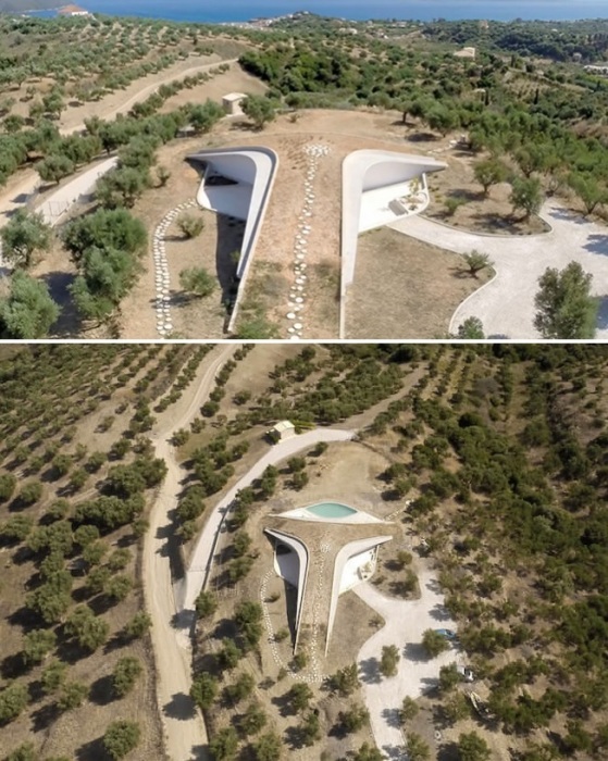 Летняя резиденция Villa Ypsilon образует холм Y-образной формы (Пелопоннес, Греция). | Фото: habitat-bulles.com.