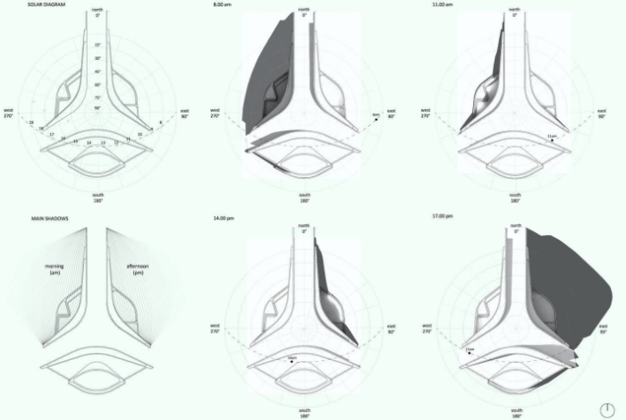 Если говорить о планировке дома и участка, то они определялись согласно структуре самого здания. Раздваивающиеся «дорожки» крыши позволили обустроить три внутренних двора, которые образуют отдельные полусферы. Они задействованы в зависимости от траектории движения светила, тем самым обеспечивая жильцов прекрасными зонами отдыха на свежем воздухе в любое время. «Западный внутренний двор предназначен для завтрака, который можно растянуть до полудня, восточный – порадует прохладой в обеденное время, а южный – идеальное место для водных развлечений или отдыха поздним вечером», – объясняют архитекторы свое дизайнерское решение.