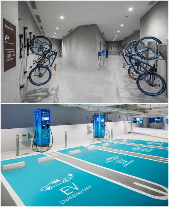 Парковка для электромобилей и велосипедов для офисных сотрудников (CapitaSpring, Сингапур).