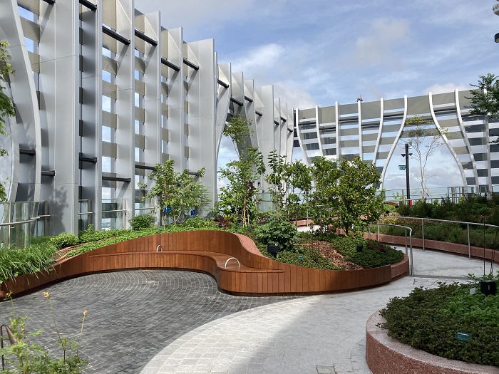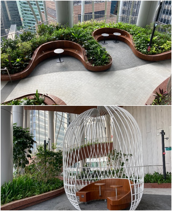 Зоны отдыха для офисных работников окружены буйной растительностью (CapitaSpring, Сингапур). Если говорить о внутренней планировке офисных помещений, то у сотрудников любой из фирм или организаций, арендующих помещения в CapitaSpring есть уникальная возможность наслаждаться благоухающей зеленью и видом на Сингапур, во время рабочего процесса. Для этих людей предусмотрены и общие зоны отдыха, и точки общественного питания, к которым нет доступа посетителям, пришедшим просто на экскурсию.