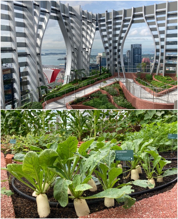 На крыше небоскреба разбиты грядки, где горожане могут увидеть, как растут овощи и зелень (CapitaSpring, Сингапур).
