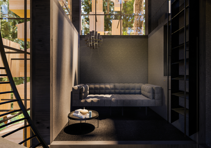 Зона гостиной на нижнем уровне номера, окруженного стаями птиц (концепт Biosphere). | Фото: miamistandard.news.