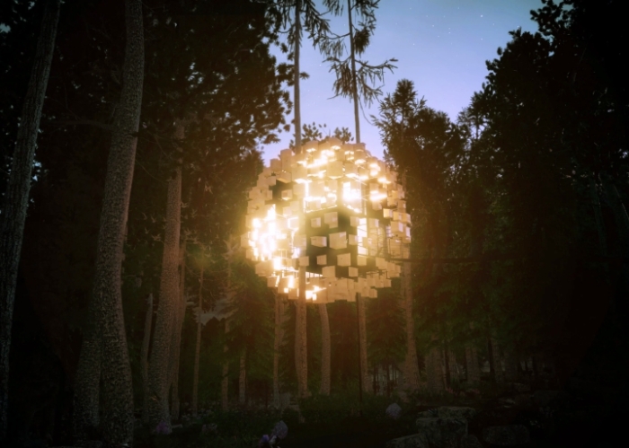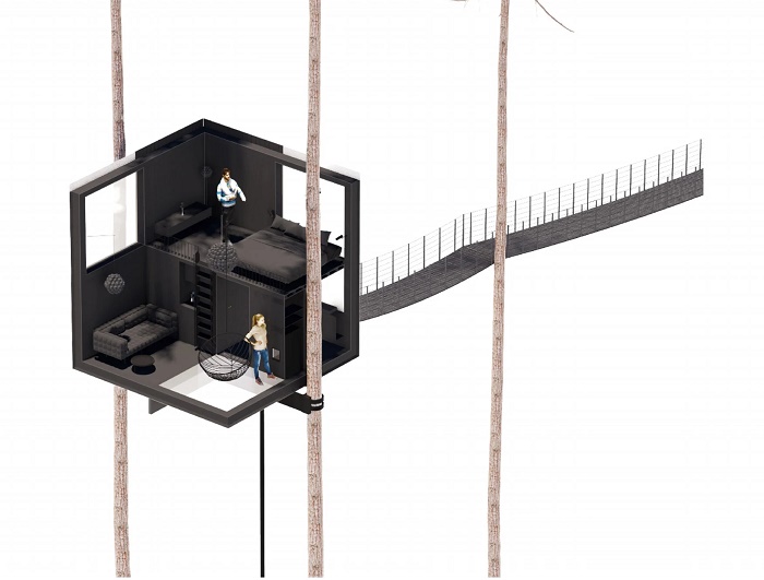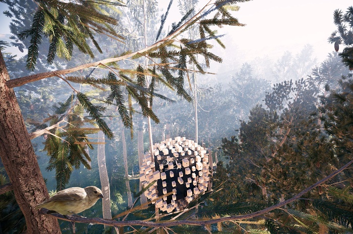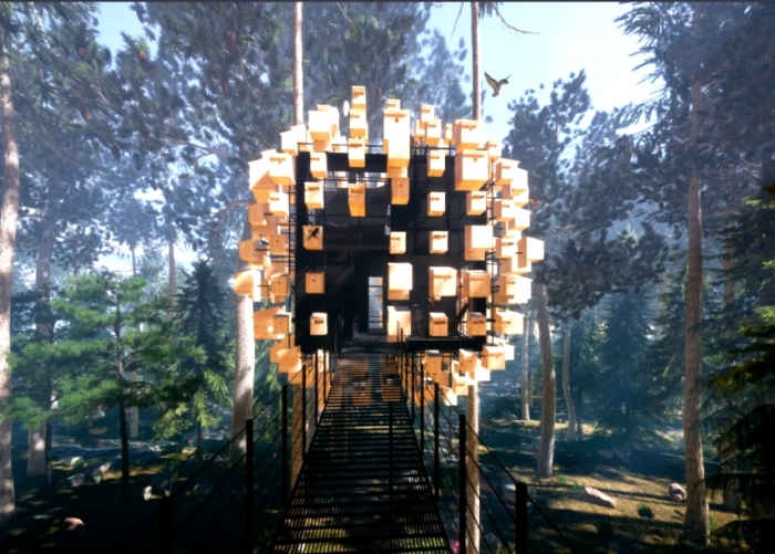 Учитывая, что проект только планируют реализовать, мы можем лишь наслаждаться 3D-визуализацией экстерьера и интерьера домика на дереве. Как уже сообщалось, квадратную структуру, часть стен, потолка и пола которой сделаны из тонированного трехкамерного стекла, будут окружать более трехсот деревянных скворечников для разных видов птиц. Поскольку это все-таки домик на дереве, то его планируют установить между двумя соснами высоко над землей. Попасть же в этот неординарный птичий мир можно по подвесному мосту, откуда открывается превосходный вид на первозданный лес.
