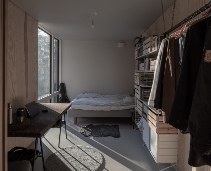 Одна из спальных комнат на втором уровне загородного дома (Container House, Швеция). | Фото: afasiaarchzine.com.