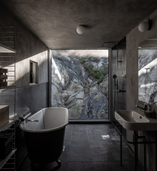 Большая ванна установлена недалеко от окна, занимающего всю стену (Container House, Швеция). | Фото: manstham.com.