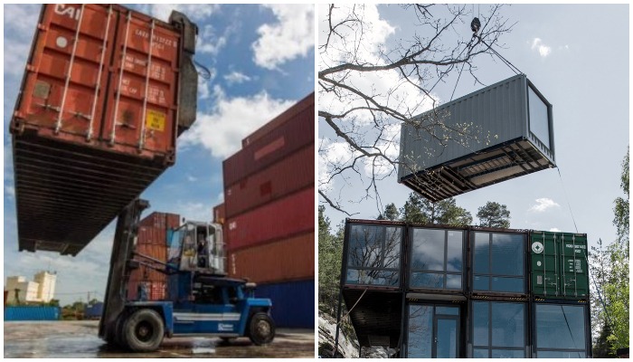 Строительство контейнерных домов становится популярным не только в Америке, но уже и в Европе. Интересный вариант сборки загородной резиденции из списанных контейнеров появился в природной зоне Стокгольма, где семья из 5 человек предпочитает отдыхать. Для строительства дома на крутом участке земли именно такая структура стала спасительным кругом, ведь крепкие сформированные каркасы намного легче устанавливать, чем создавать все с нуля. Тем более, что для строительства в природной зоны существует очень много ограничений.