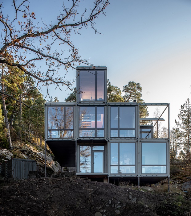 Одна стокгольмская семейная пара с тремя детьми пожелала иметь загородную резиденцию, созданную из грузовых контейнеров. Это было самым разумным решением в их случае, поскольку участок земли, находящийся в природной зоне, имел сложный рельеф. На крутом каменистом склоне, где дождевая вода идет потоками в близлежащее озеро строить дом невозможно, тем более что нормами запрещено проводить масштабные работы в лесном массиве. Оставался один выход – устанавливать дом на сваях, а для ускорения и удешевления процесса списанные морские контейнеры подходили лучше всего.