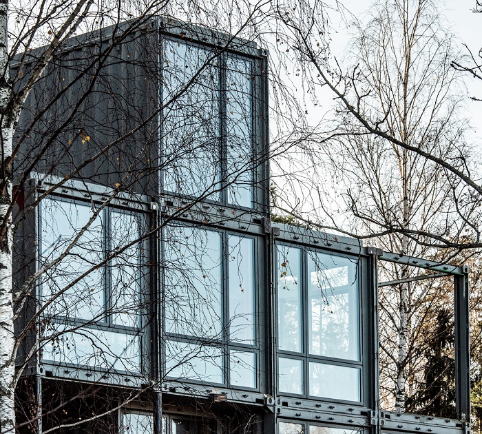 Если говорить об архитектурной композиции то, как и следовало ожидать, преобладают прямые углы и строгие линии формы, повторяющие геометрию самих контейнеров, которые не стали преображать или облицовывать. Несмотря на то, что в облике структуры явно просматривается индустриальный стиль, она неплохо вписалась в природный ландшафт, прекрасно сочетаясь с крутым каменистым склоном. Этому поспособствовал и нейтральный серый цвет экстерьера, и масштабное остекление, которое сделало трехэтажное здание более невесомым и приспосабливающимся под окружающий пейзаж.