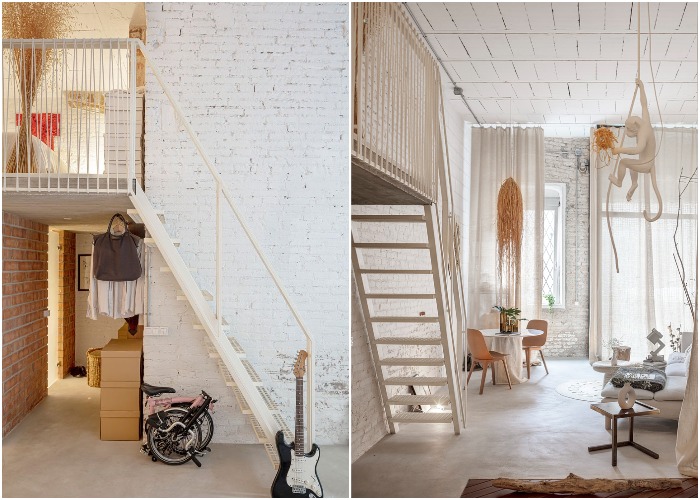 Авторы Novate.ru, рекомендуют обратить внимание на то, как мастерски дизайнерам студии удалось увеличить площадь квартиры. Для расширения пространства и организации открытой планировки основных функциональных зон, они сделали второй уровень, куда была вынесена спальня, тем самым значительно увеличили возможности этого помещения. Такому внедрению поспособствовали высокие потолки и наличие масштабного остекления, которое сделало пространство более воздушным и объемным.