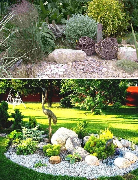 ♦ делать гравийные декоративные бордюры, фигурные отсыпки, имитацию «сухого ручья» или использовать в качестве фона для композиций, фонтана или группового размещения садовых фигурок/арт-объектов;