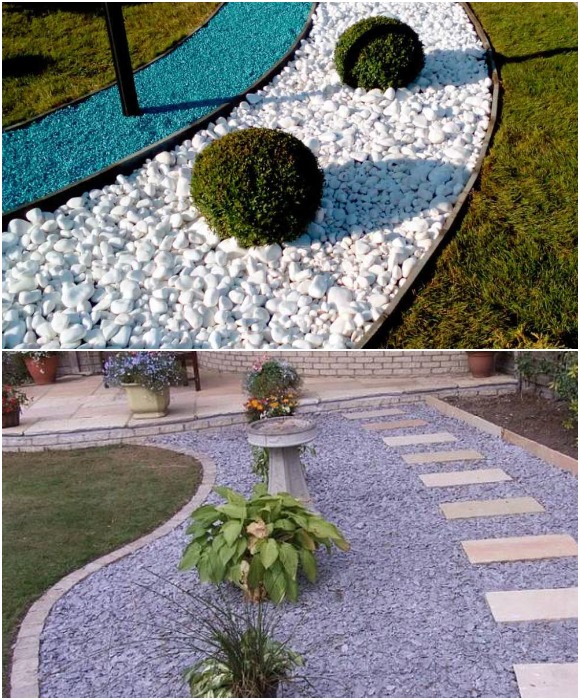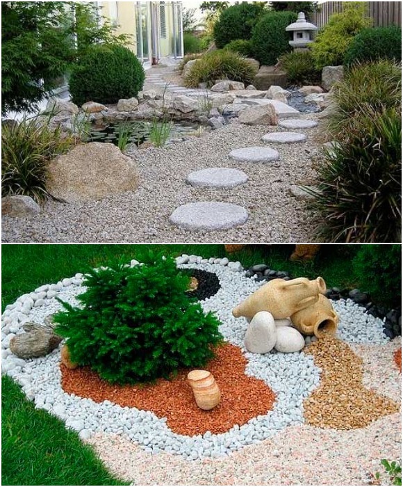 Считается, что больше всего в создании великолепных рокариев и гравийных садов преуспели японцы, которые помимо вышеперечисленных элементов использовали декоративные пруды, каскады, фонтаны, оригинальные каменные поилки для птиц и некоторые традиционные безделицы. В Европе сады хоть и оформляли в классическом стиле, с преобладанием клумб геометрической формы и орнаментальными цветниками, тем не менее без гравийных дрожек никогда не обходилось. Именно они эффектней всего подчеркивают красоту пышной растительности.