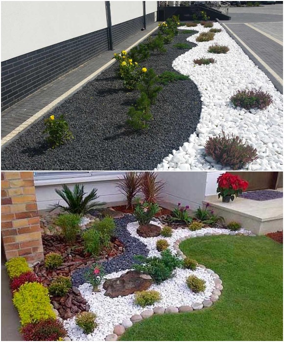 Очень привлекательно выглядят гравийные клумбы перед забором.