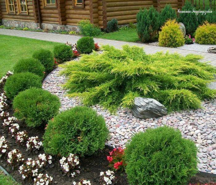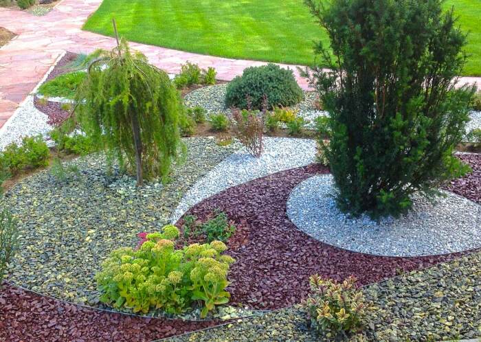 В цветных композициях нельзя переусердствовать. Также стоит понимать, что прежде чем отправляться в строительные центры за материалом, нужно определиться с площадью, которую планируете облагораживать и просчитать приблизительное количество гравия или гальки. Как правило, на 1 кв. метр отсыпаемой площади уходит от 25 до 30 кг материала, все зависит от толщины слоя. Стоит помнить и о целях, которые преследуете при покупке гравия. Если решили воссоздать горный уголок природы, то лучше выбирать камень натуральных оттенков – бежевого, серого, молочного цветов. Для живописных композиций идеальным вариантом станут контрастные тона декоративного гравия, которые дополнят сад вечнозеленых растений динамикой и подчеркнут их великолепие.