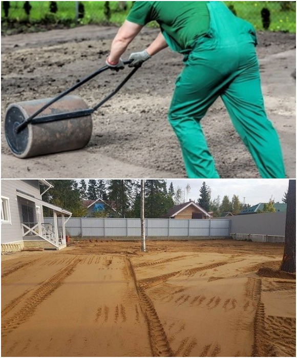 ♦ После этого площадку нужно утрамбовать и засыпать мелким песком слоем 5-10 см, все зависит от свойств грунта. В некоторых случаях этот этап можно пропустить и приступать к укладке плотного агроволокна, геотекстиля или перфорированной черной пленки.