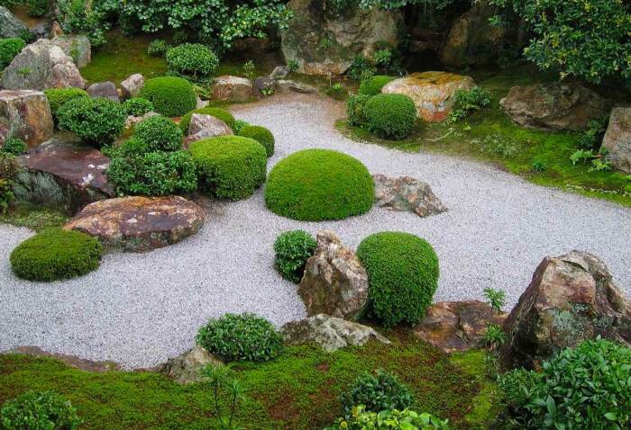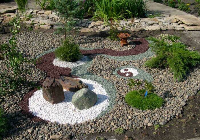 Как следует из названия, основным материалом для создания сада является гравий (горный сыпучий строительный материал). Именно он выполняет главную декоративную и функциональную роль. Гравий и средней величины дикие камни чаще всего используют для оформления в саду альпинария, каменистой горки (рокарий), стараясь воссоздать средиземный уголок, где между камней пробивается лаванда, базилик, котовник и т. д, несколько декоративных деревьев, имеющих нестандартную форму и небольшие размеры.