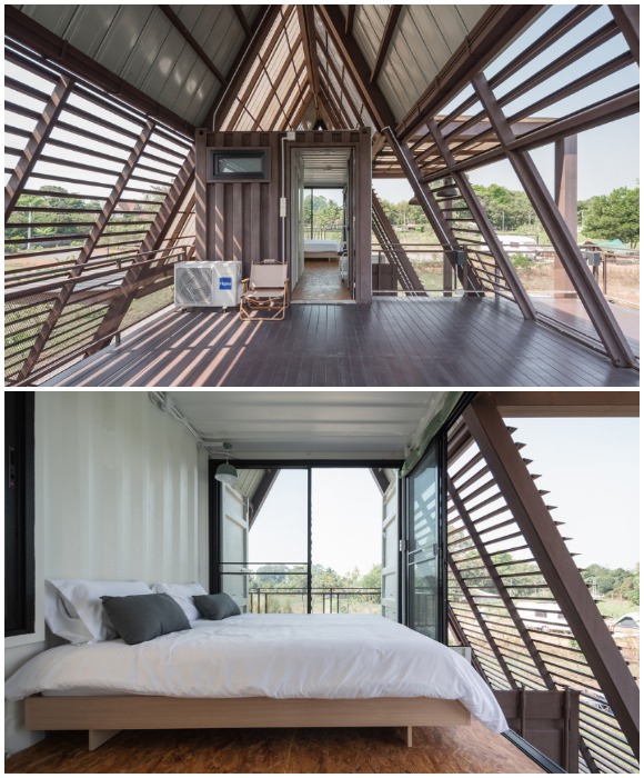 А-образная крыша стала не только эффектным украшением загородного дома, она спасает от ливней и палящих лучей солнца (Container Cabin, Таиланд). | Фото: designboom.com.
