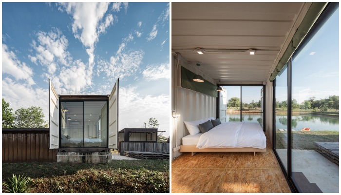 Рядом с загородным домом имеется пруд, который спасает от подтоплений и жары, создавая прекрасный фон (Container Cabin, Таиланд). | Фото: yankodesign.com.