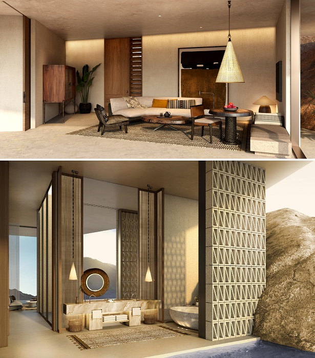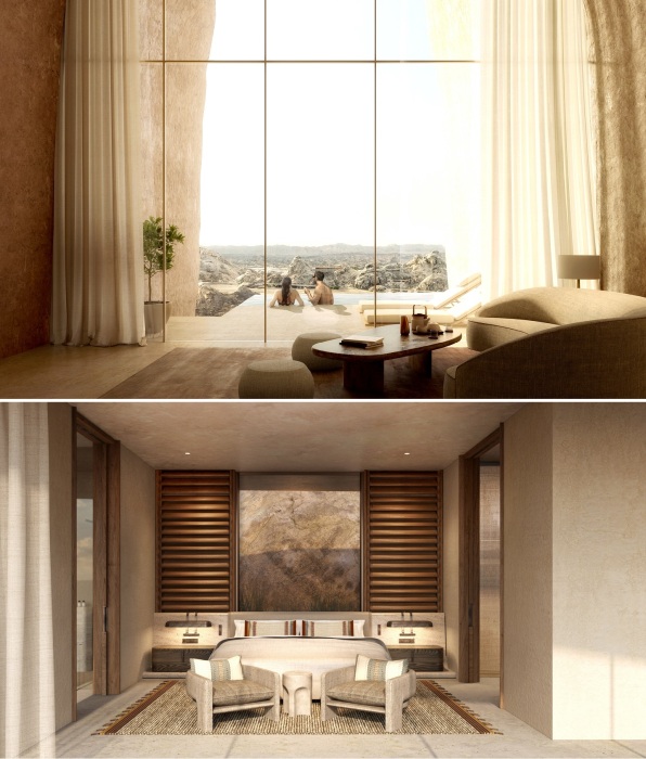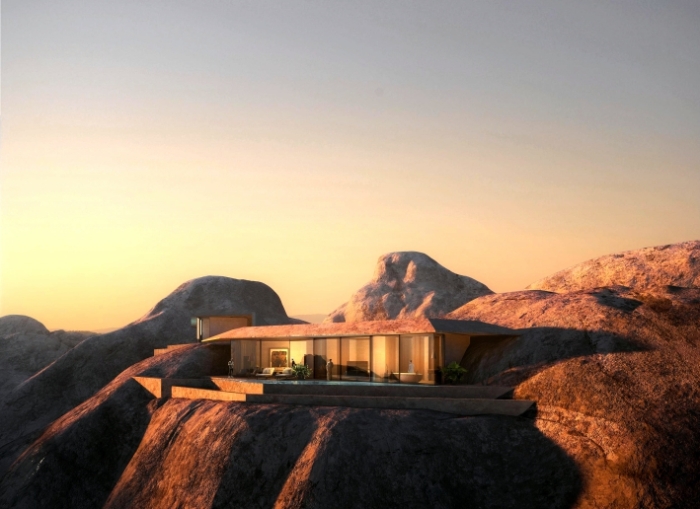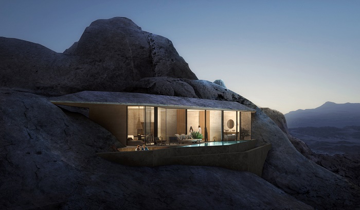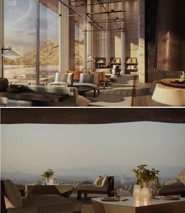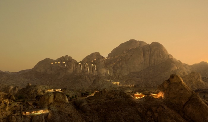 «Пустынная скала — один из самых драматичных пустынных ландшафтов в мире, поэтому мы хотели использовать архитектуру как особенный способ уважения и почтения к памятнику природы. Для того чтобы гости смогли физически соединиться с этим чудным местом и насладиться потрясающей природной красотой Саудовской Аравии, мы использовали природные материалы и интегрировали курорт в скалу», — говорит Чад Оппенгейм, основатель компании Oppenheim Architecture.