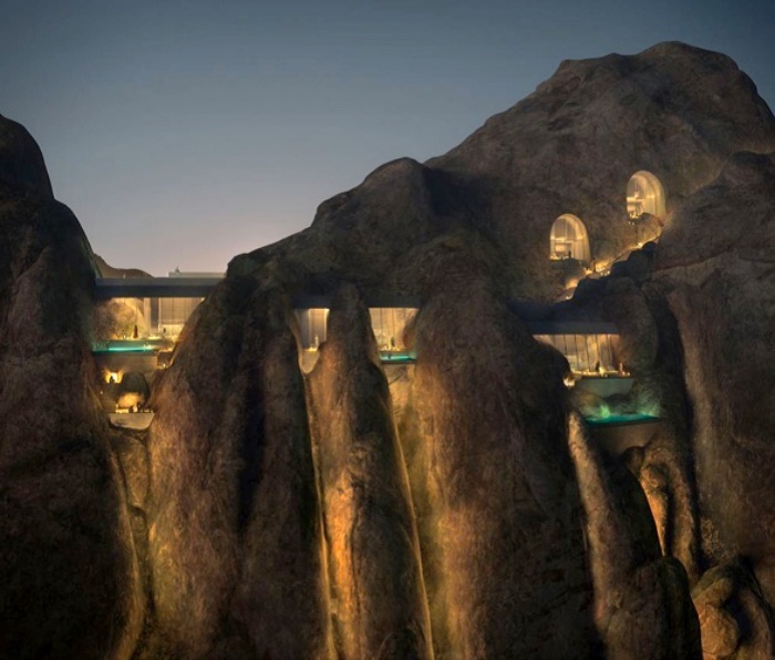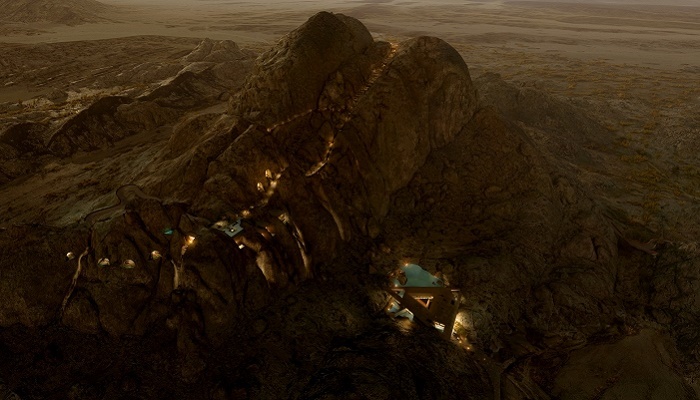 Только когда зажигаются огни, можно увидеть гостиничные номера и отдельные резиденции, спрятанные внутри горной гряды (концепт курорта Desert Rock). | Фото: thenationalnews.com.