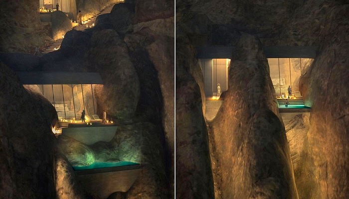 Пример того, как может выглядеть гостиничный номер, внутри скалы (концепт курорта Desert Rock).