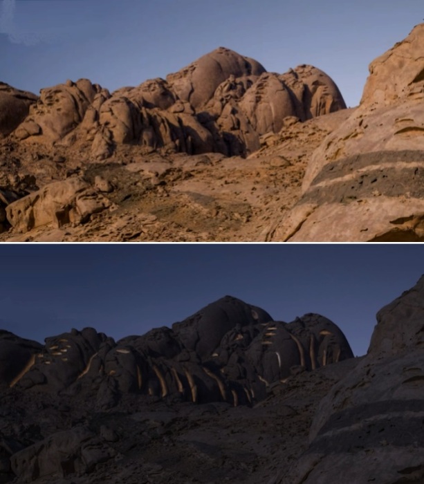 Глядя на «Пустынную скалу» днем, невозможно представить, что внутри обустроены роскошные номера (концепт курорта Desert Rock).