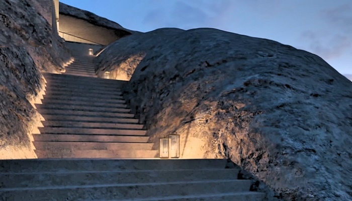 Попасть на территорию горного курорта Desert Rock можно по скрытой лестнице, которая огорожена каменными стенами, напоминающими огромные валуны (концепт). | Фото: franquicias-de-internet.info.