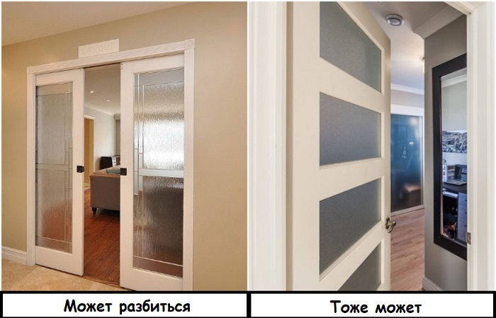 С одной стороны, стеклянные межкомнатные двери будто растворяются в пространстве, делают его легче и воздушнее. С другой же – они не могут гарантировать даже минимальный процент приватности, а еще – являются опасными. Если двери выполнены из непрочного стекла, вы можете их случайно разбить. Гораздо хуже, если в дверь нечаянно попадет мячом ребенок – тогда осколки разлетятся по всей комнате и кого-то поранят. Именно поэтому безопаснее будет отказаться от таких дверей или заменить их на модели, выполненные из закаленного стекла – если они и разобьются, то на закругленные осколки без острых краев. Такие двери стоят дороже, но при этом являются намного безопаснее.