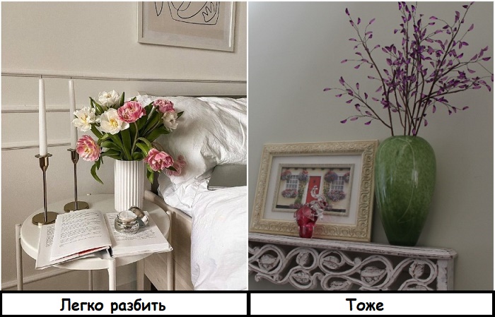 Вазы и прочие хрупкие элементы декора кажутся абсолютно безопасными, когда спокойно стоят на полках и просто радуют глаз. Но в квартире с маленькими детьми и домашними питомцами ни в чем нельзя быть уверенными на 100%, особенно в том, что все предметы будут неподвижно стоять на стеллаже. Кошка может запрыгнуть на полку и сбросить вазу либо статуэтку, а ребенок – нечаянно наступить на осколки и пораниться. Если очень хочется украсить квартиру подобными предметами декора, храните их в шкафу за стеклянными дверцами. Или, в крайнем случае, ставьте на самые верхние полки, чтобы ни дети, ни животные точно до них не добрались.