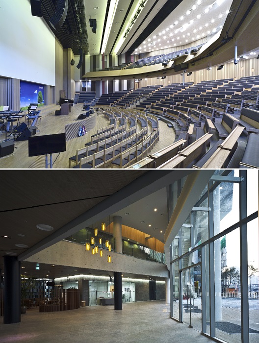Главный молитвенный зал и один из вестибюлей церкви (The Sarang Community Church, Южная Корея). Интересный факт: Главной идеей проекта стало объединение трех символов – крепости (Господь - надежная крепость), ковчега (Ноев ковчег, который спасает мир) и голубя (символы Святого Духа и Мира).