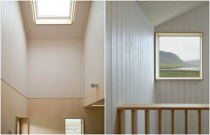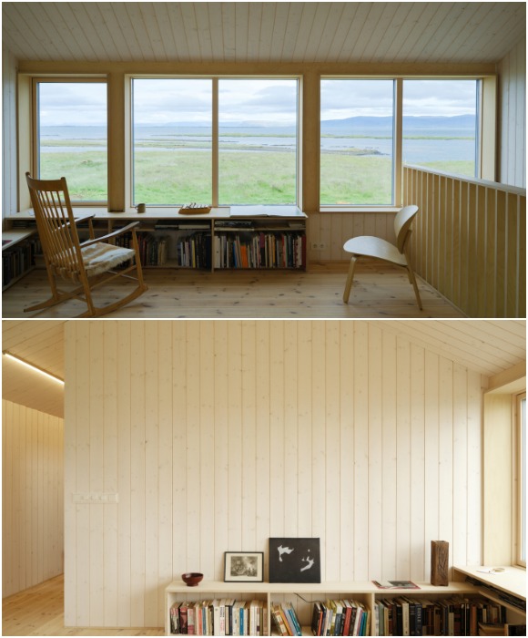 Из гостиной открывается прекрасный вид на природный заповедник Брейдафьордур (Исландия). А вот в основе дизайна интерьера лежит простота, которую давно уже считают роскошью. Спокойный интерьер нейтральных тонов, чтобы не отвлекал от выставленных произведений искусства; полированный бетон в качестве напольного покрытия (на первом этаже); наличие природного камня (из местного пляжа); натуральная древесина как в облицовочных материалах, так и встроенной мебели (оригинальные модели разрабатывали дизайнеры студии); экспериментальная покраска (различными пигментами), которой занимался сам хозяин – все это сделало внутреннее пространство стильным и современным.